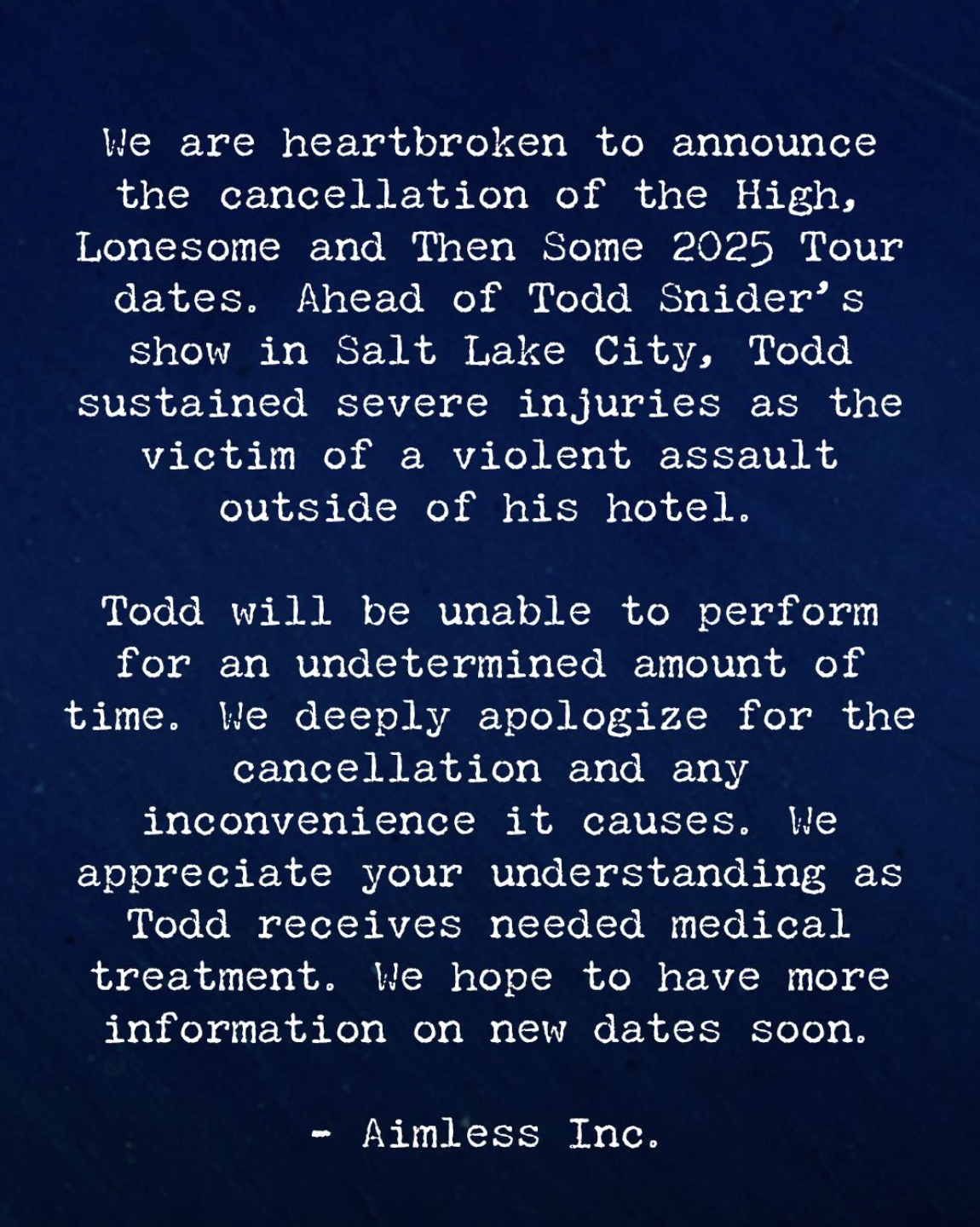 On November 3, Todd sustained serious injuries after a “violent assault” outside of a Utah hotel. The incident forced the artist to cancel the remainder of his High, Lonesome and Then Some Tour.