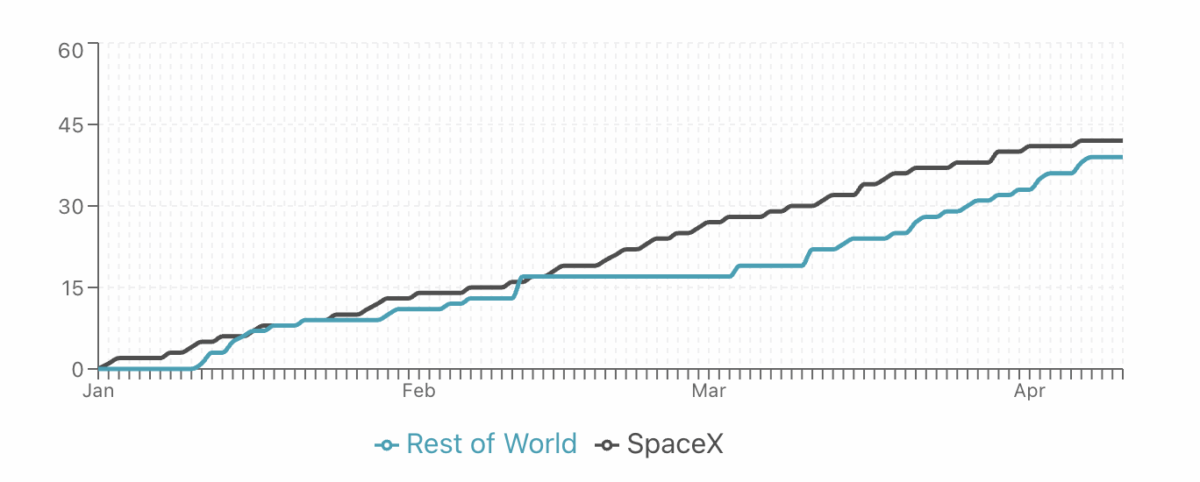 In 2026, as of April 10, SpaceX has managed to outpace all rocket launches on Earth, with Flight Atlas citing 42 rocket launches conducted by SpaceX, compared to 39 globally.