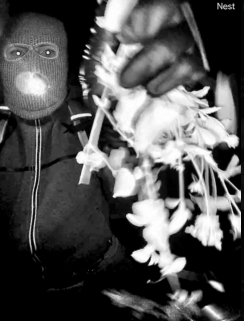The first video shows the subject attempting to cover up the camera with their hand and with brush they gathered from a flower bed in front of Guthrie’s home.