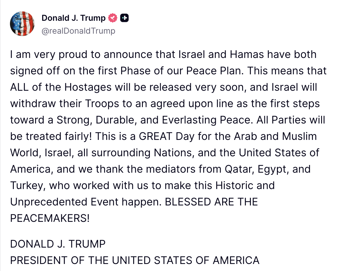 See Trump’s full announcement of Israel and Hamas’ acceptance of the terms of Phase One of the peace plan, here: