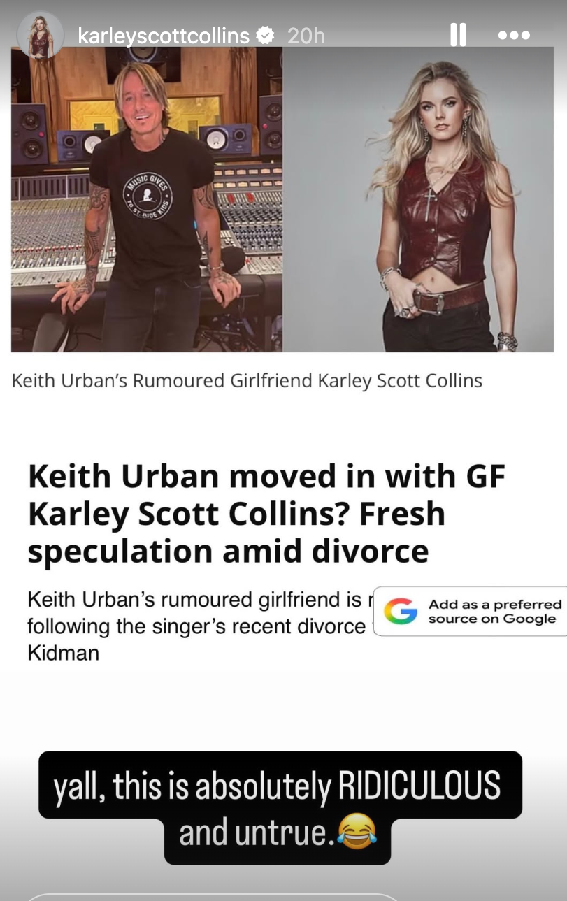She ended up sharing a screenshot of an article on her Instagram story that had a headline that read: “Keith Urban moved in with Karley Scott Collins? Fresh speculation amid divorce.”