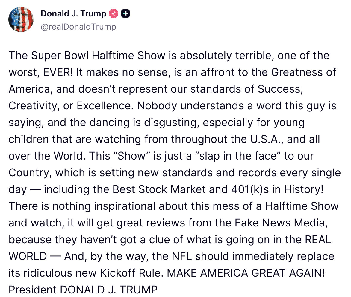“The Super Bowl Halftime Show is absolutely terrible, one of the worst, EVER!” he started. “It makes no sense, is an affront to the Greatness of America, and doesn’t represent our standards of Success, Creativity, or Excellence.”