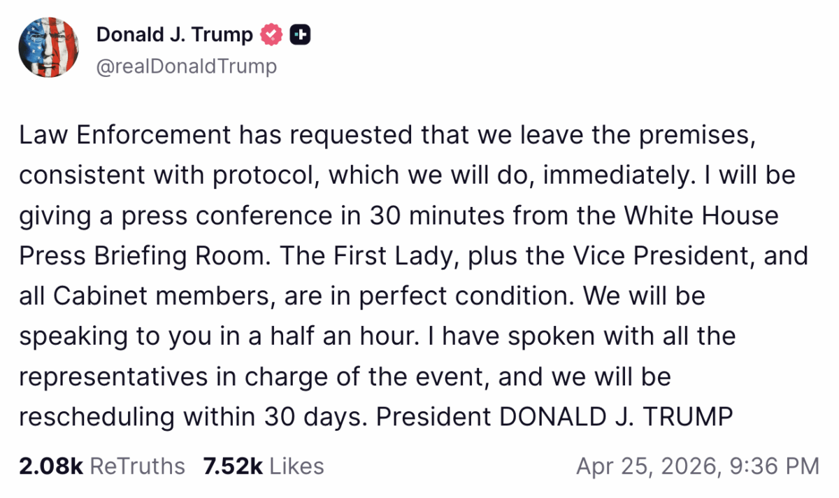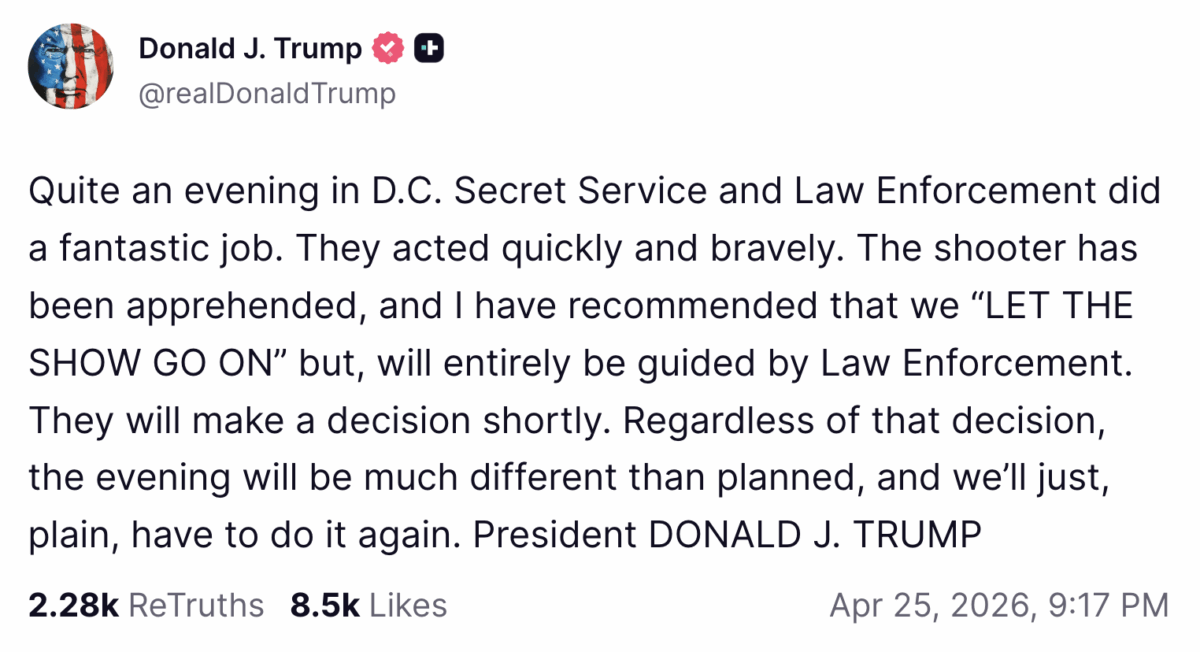 Responding to the April 25 shooting at the White House Correspondents’ Association Dinner, Trump posted on Truth Social, saying, “Secret Service and Law Enforcement did a fantastic job. They acted quickly and bravely.”