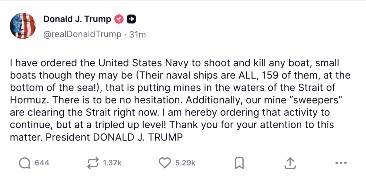 “I have ordered the United States Navy to shoot and kill any boat, small boats though they may be (Their naval ships are ALL, 159 of them, at the bottom of the sea!), that is putting mines in the waters of the Strait of Hormuz,” Trump wrote, adding, “There is to be no hesitation.”